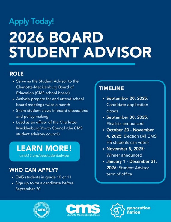 CMS juniors and sophomores are invited to apply to be a candidate for Student Advisor to the Board of Education! The Student Advisor represents the voices of CMS students at school board meetings. Find out more about the position and apply within the application period August 25-September 20, 2025!